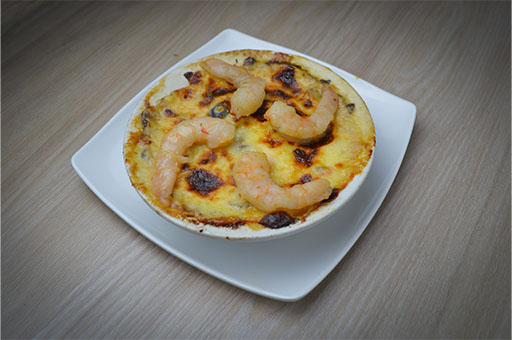 Camarón, piña Fx, tomate en cubos, salsa BBQ y queso de la casa.