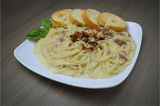 Pasta a elección en salsa carbonara con tocineta y queso parmesano.