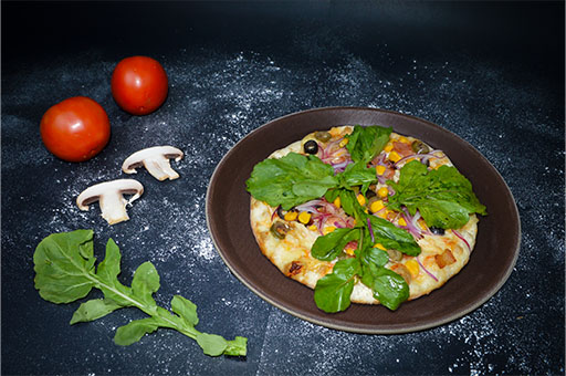 Masa de la casa, bañada en nuestra napolitana, pechuga de pollo, tocineta, maíz tierno, aceituna negra y verde queso de la casa, terminada con rúgala y cebolla morada fresca.