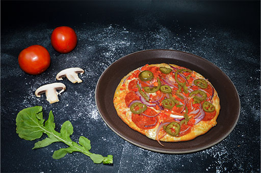 Masa de la casa, bañada en nuestra napolitana, pepperoni, jalapeños, pimentón, cebolla rojas y queso de la casa.