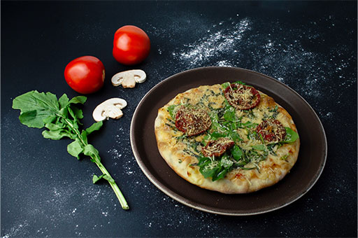 Masa de la casa, bañada en nuestra napolitana, tomate secos, rúgala, albahaca, queso parmesano, aceite de oliva y queso de la casa.